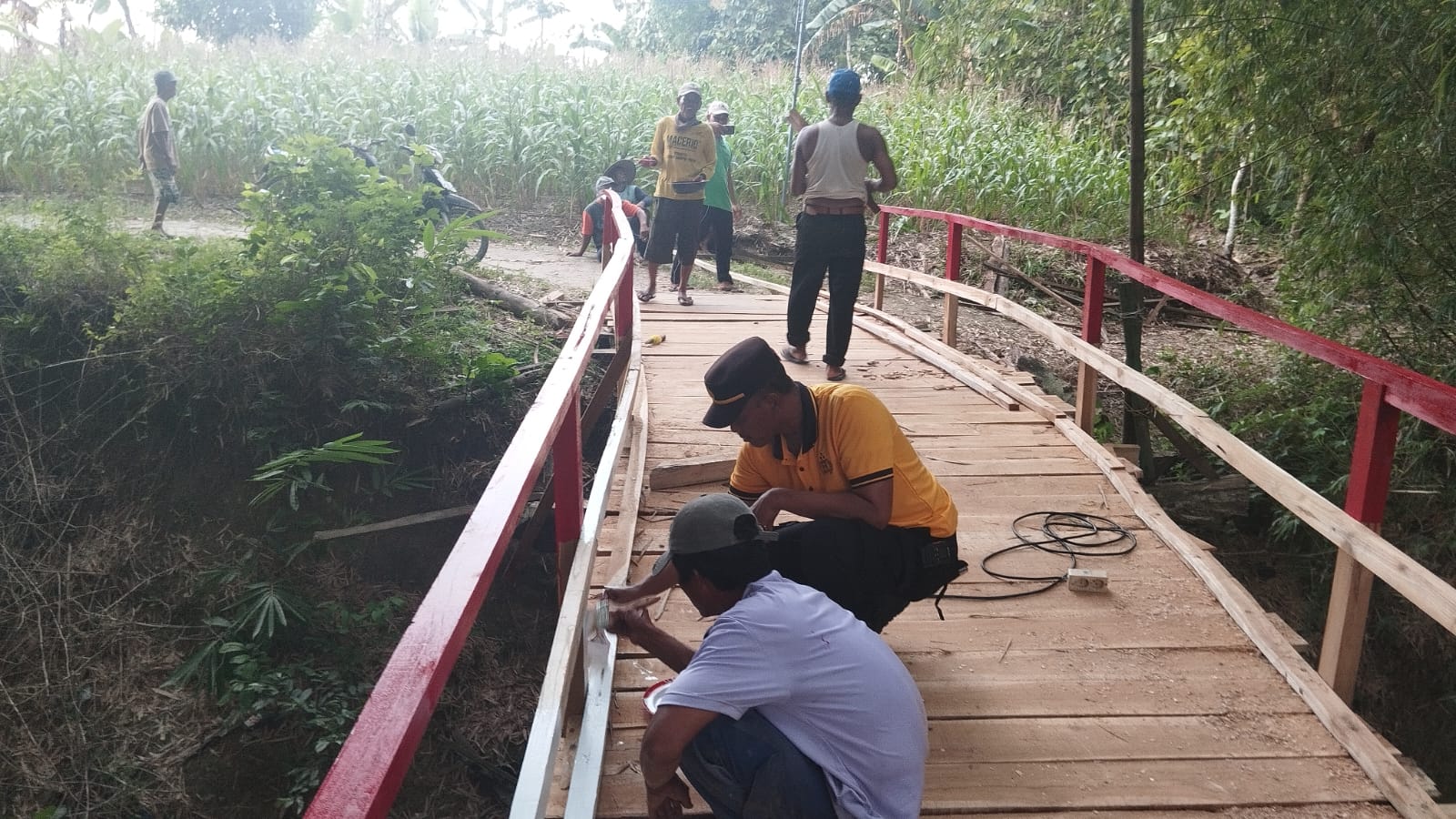 Kali ini, Kapolsek Sambeng bersama anggota dan masyarakat melaksanakan renovasi jembatan di Dusun Gondoroso, Desa Kreteranggon, Jumat (24/04).
