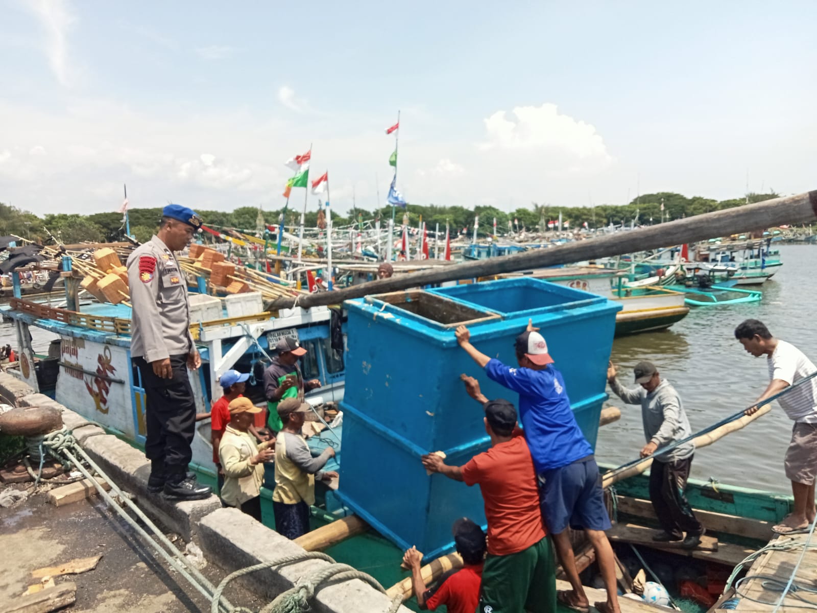 Patroli dilakukan saat nelayan menaikkan boks ikan ke kapal sekoci. Petugas tidak hanya memantau aktivitas bongkar muat, tetapi juga menyampaikan pesan tegas terkait keselamatan pelayaran dan stabilitas kamtibmas di kawasan pelabuhan.